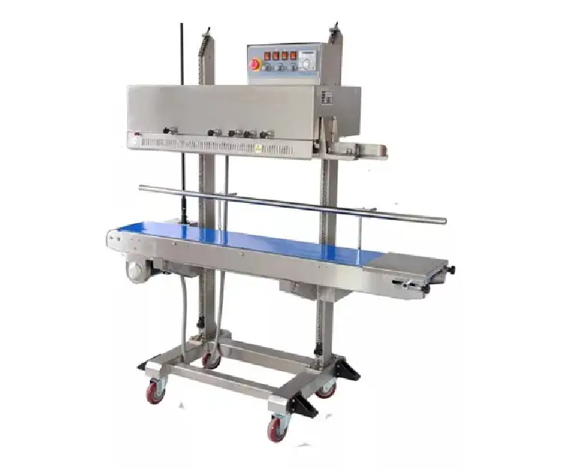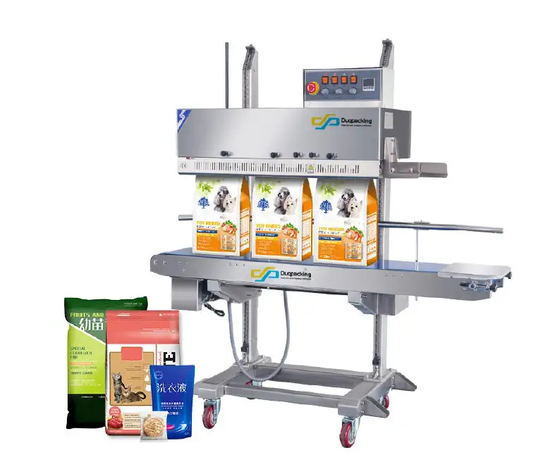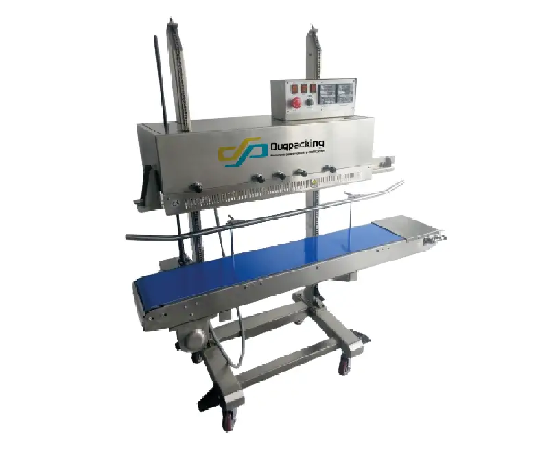 Es una selladora de banda continua vertical profesional, diseñada para fundas grandes de plástico prefabricadas, de una o varias capas que se sellan de pie. Es ideal para productos en polvo, líquidos o sólidos que se derramarían si se sellaran en posición plana.